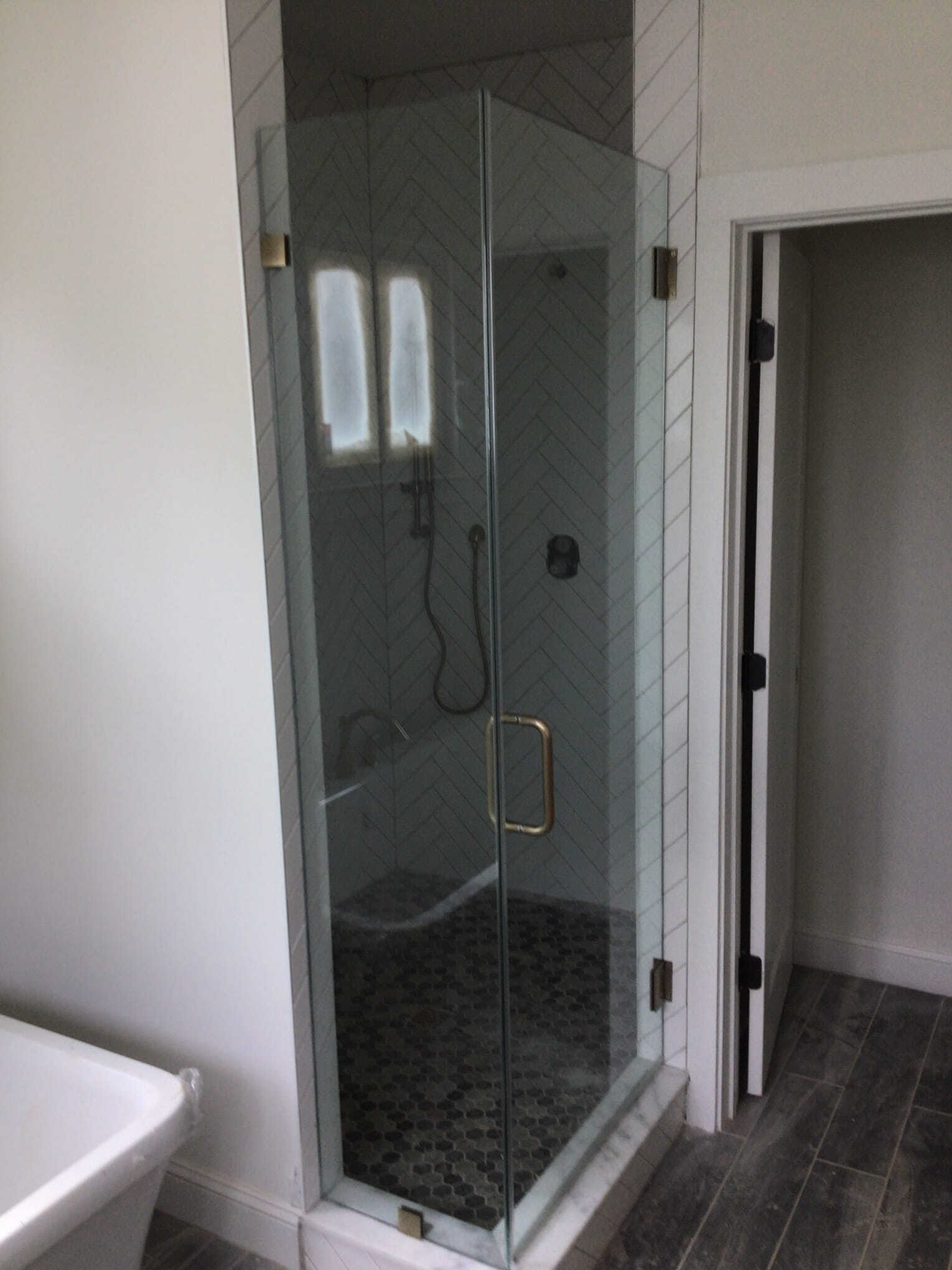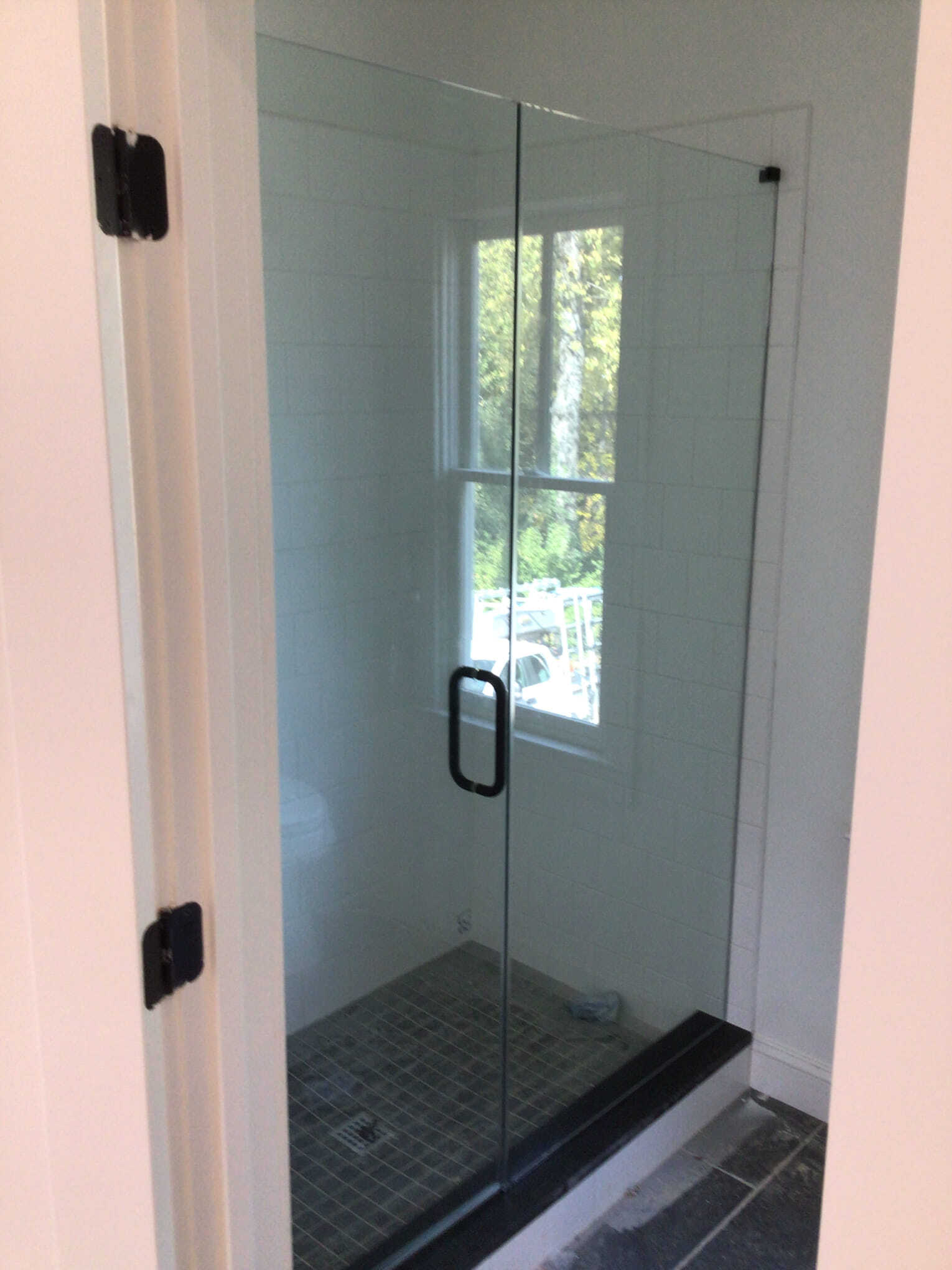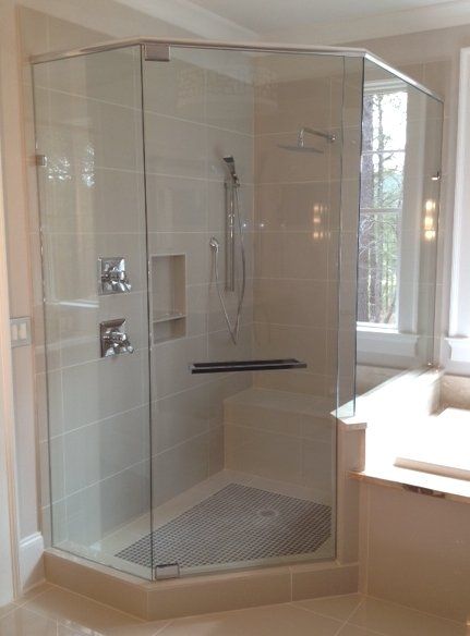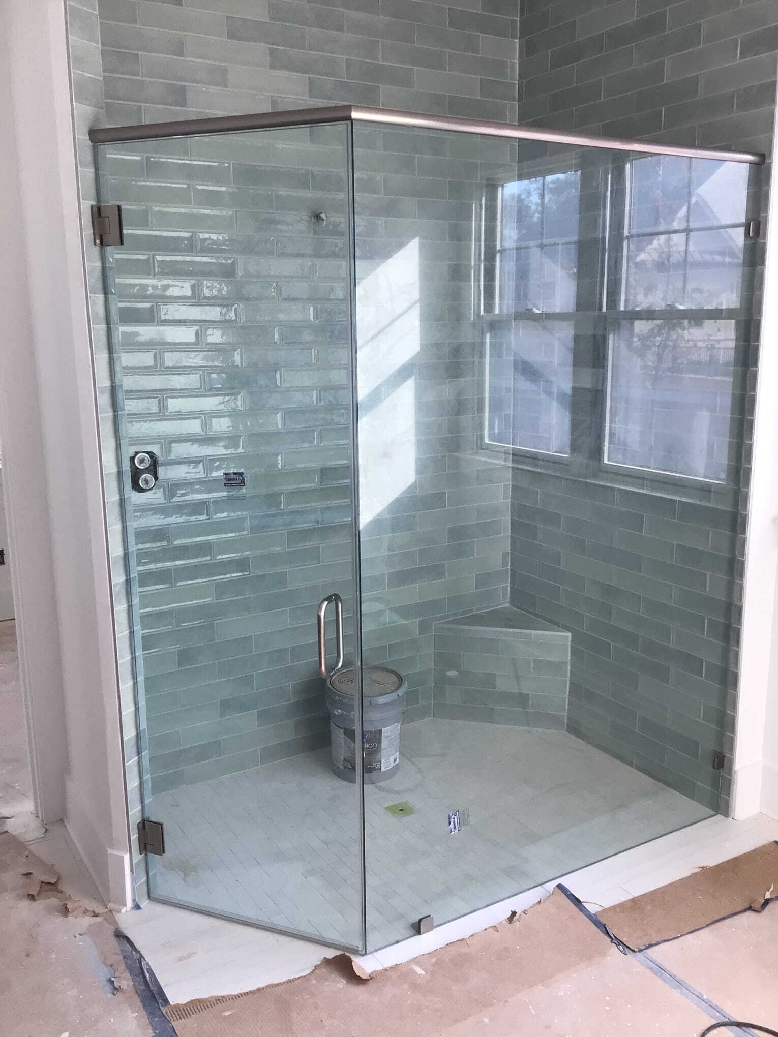 Frameless (or commonly known as heavy glass) shower enclosures are constructed of 3/8-inch tempered glass and held together with clamps and hinges. There are several hardware finishes to choose from. For larger enclosures, a header may be required. Frameless enclosures are modern, sleek and will add value to your home or new construction project.