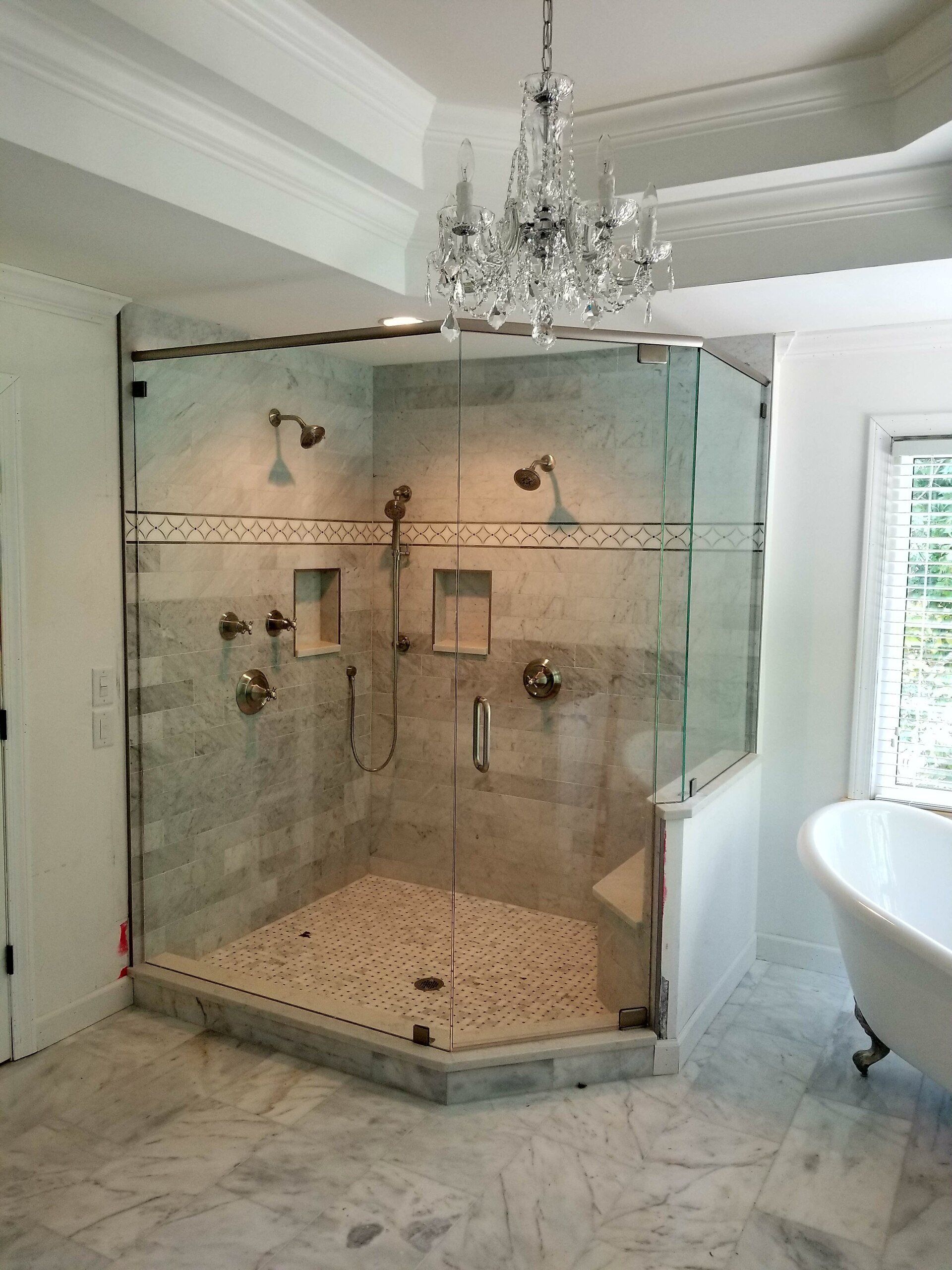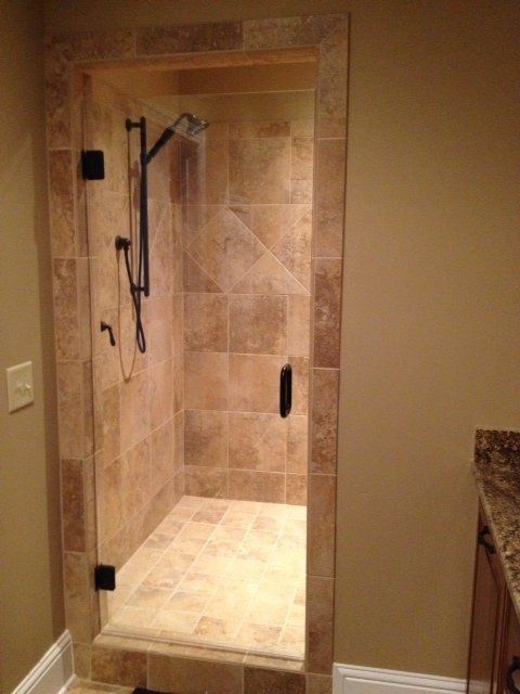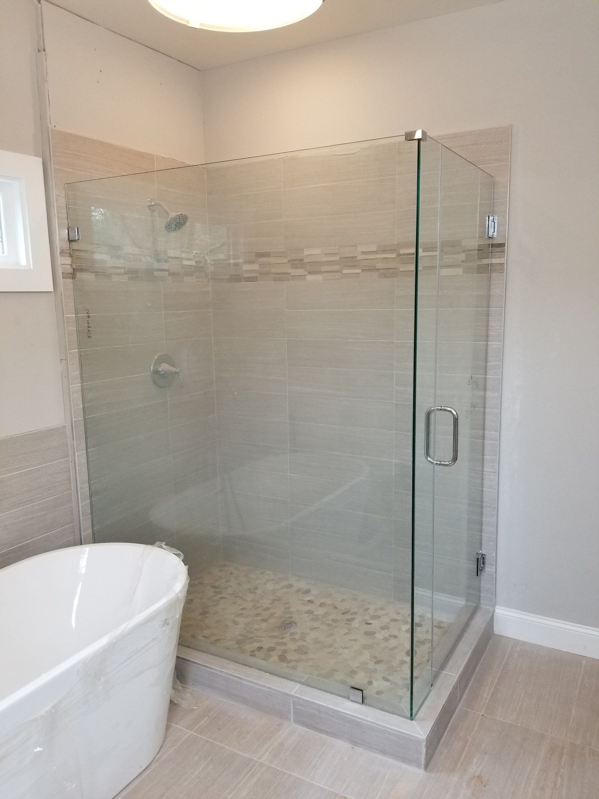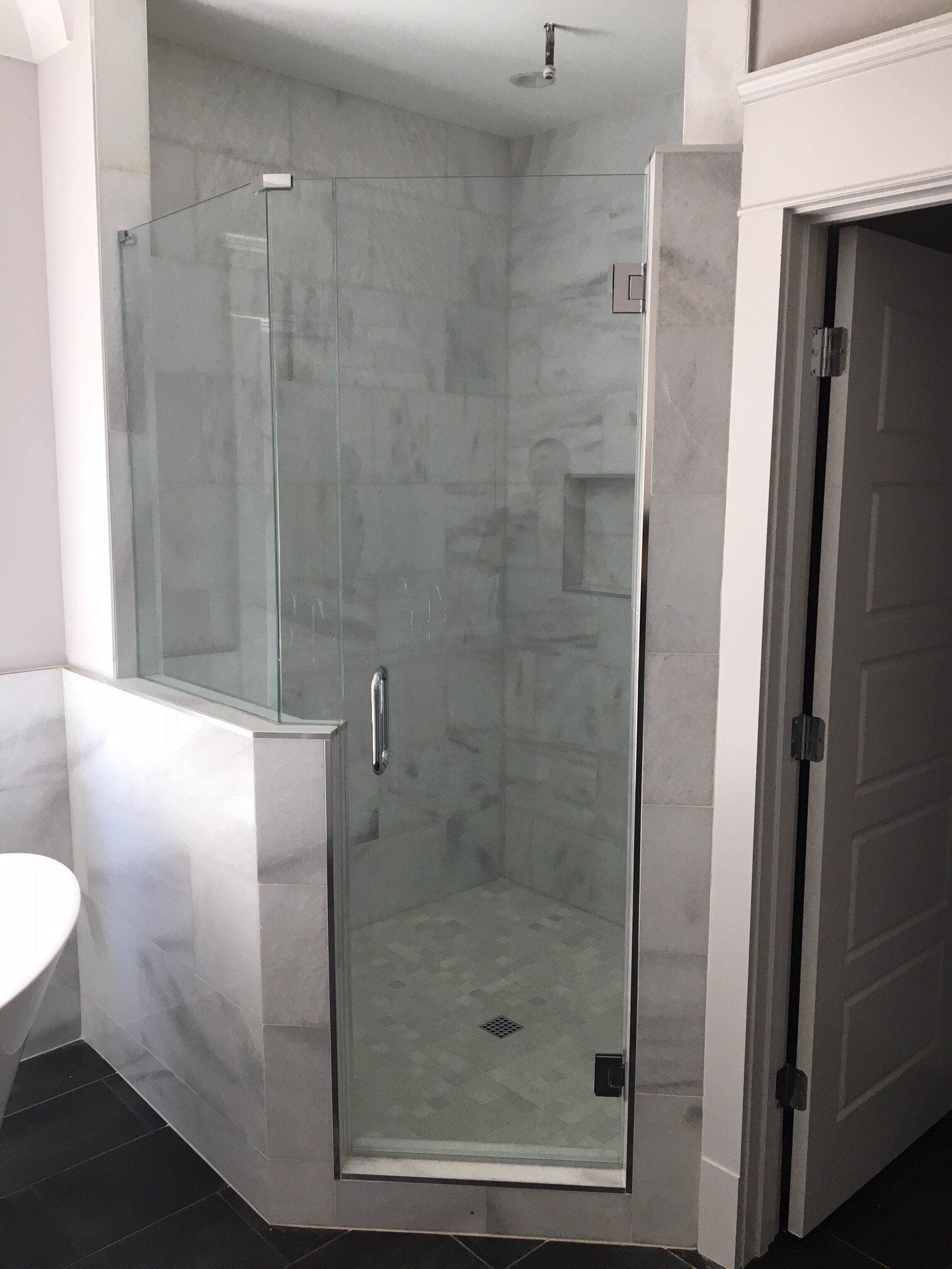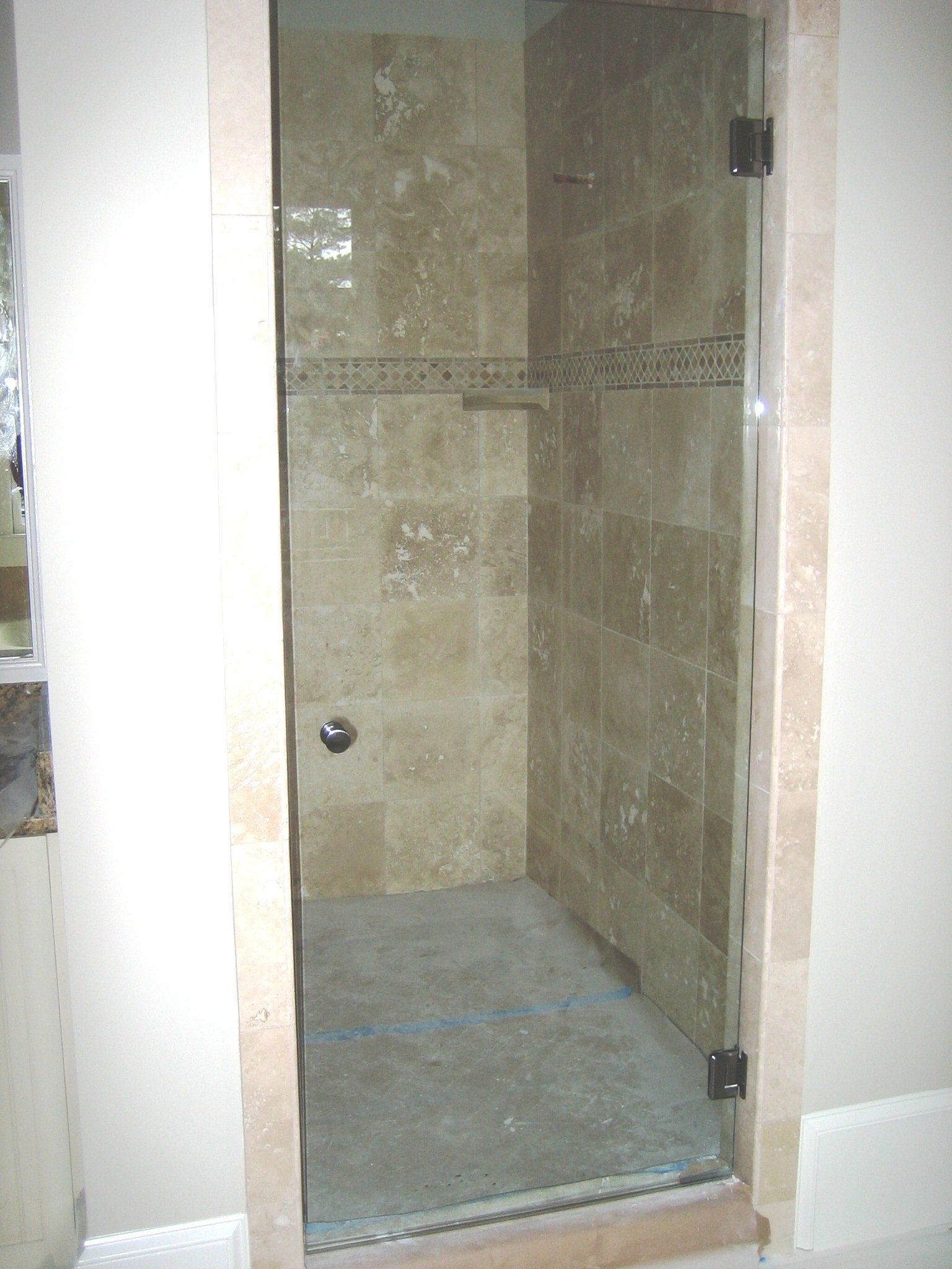 Frameless (or commonly known as heavy glass) shower enclosures are constructed of 3/8-inch tempered glass and held together with clamps and hinges. There are several hardware finishes to choose from. For larger enclosures, a header may be required. Frameless enclosures are modern, sleek and will add value to your home or new construction project.