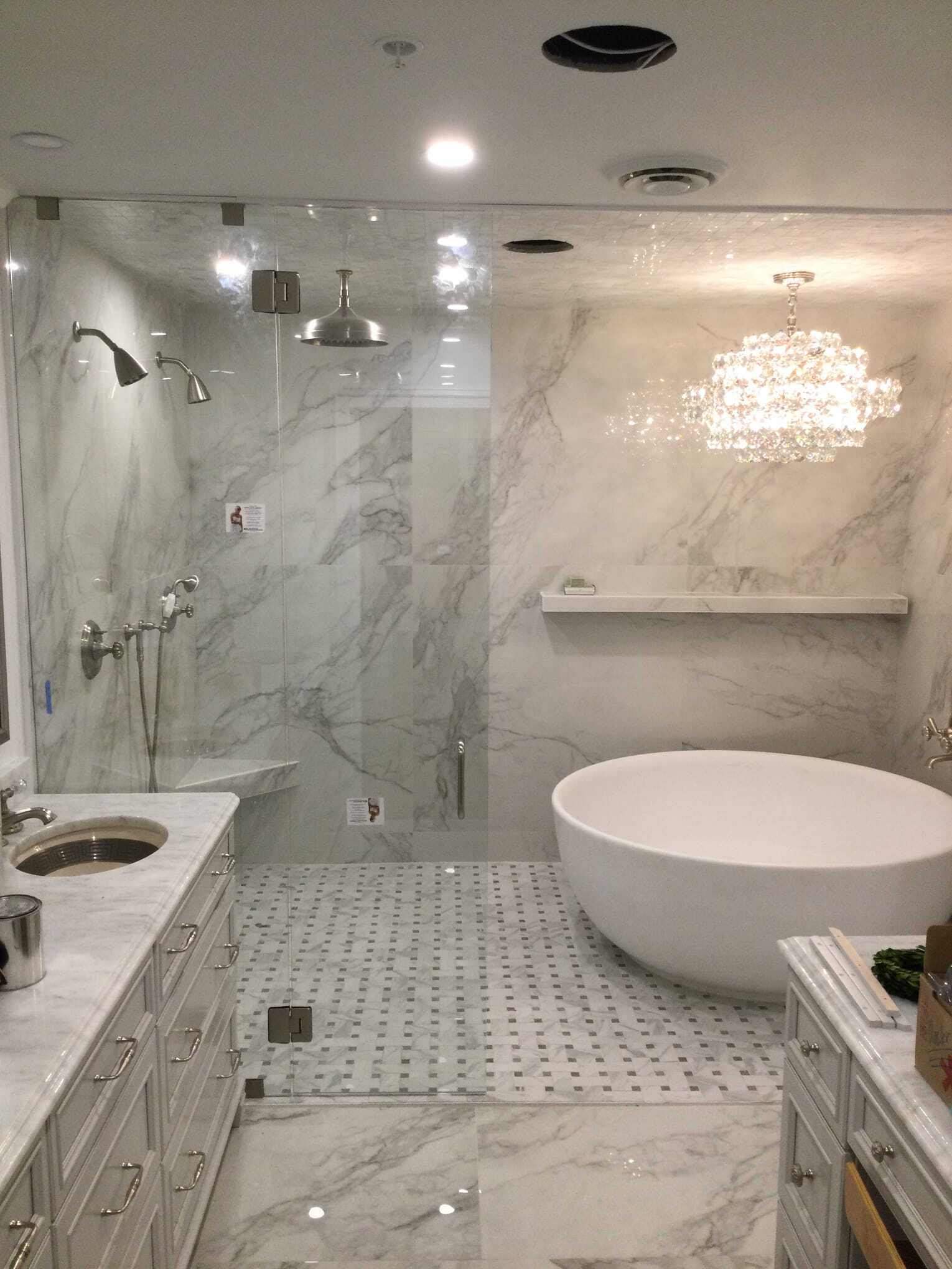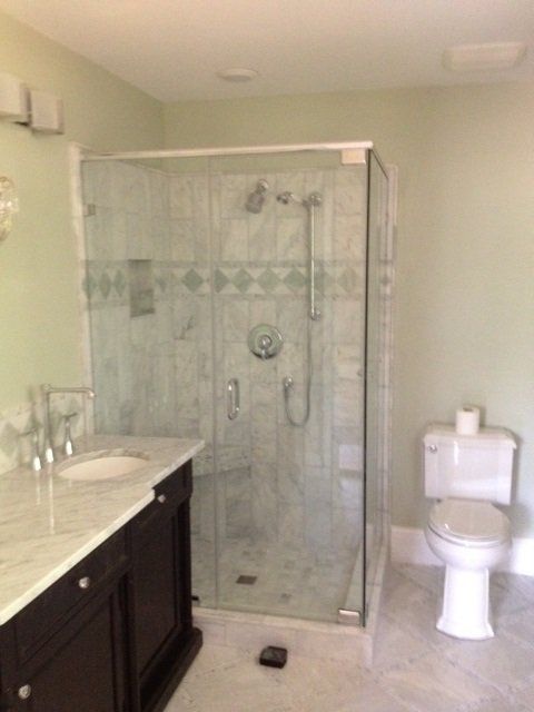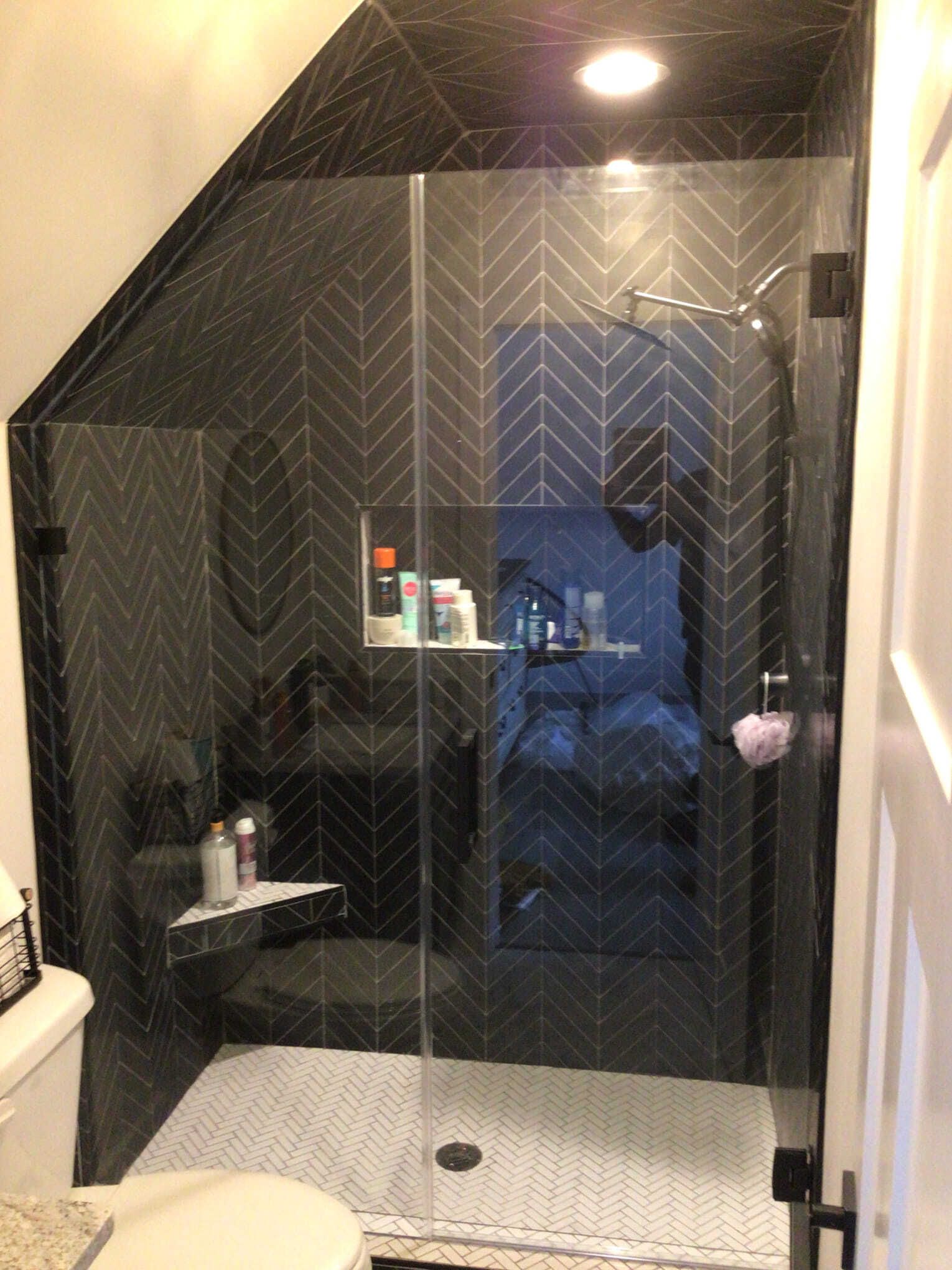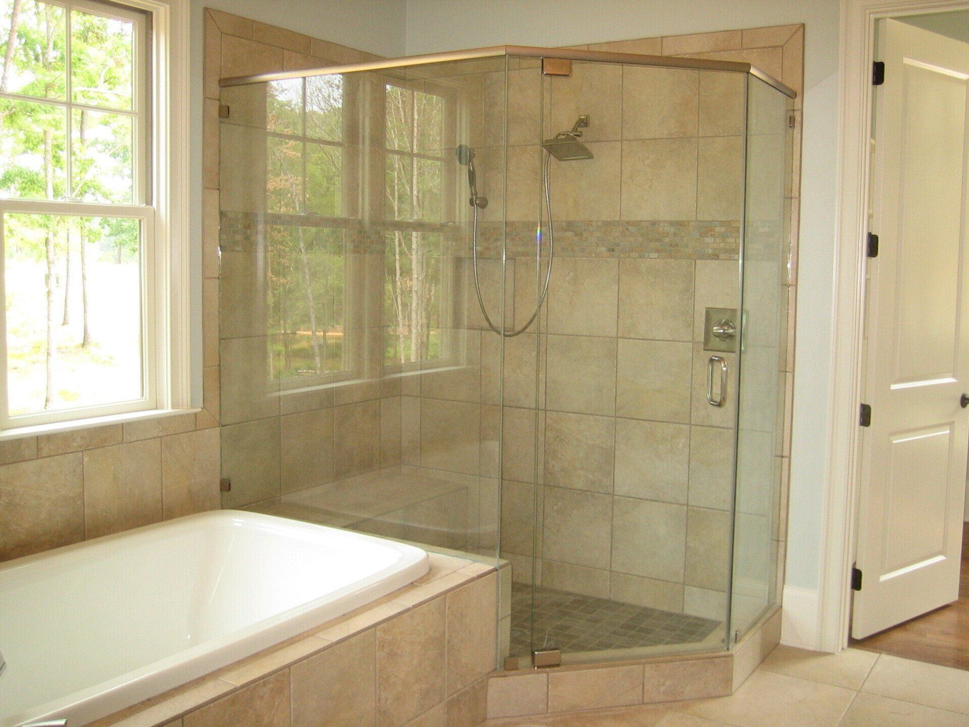 Frameless (or commonly known as heavy glass) shower enclosures are constructed of 3/8-inch tempered glass and held together with clamps and hinges. There are several hardware finishes to choose from. For larger enclosures, a header may be required. Frameless enclosures are modern, sleek and will add value to your home or new construction project.