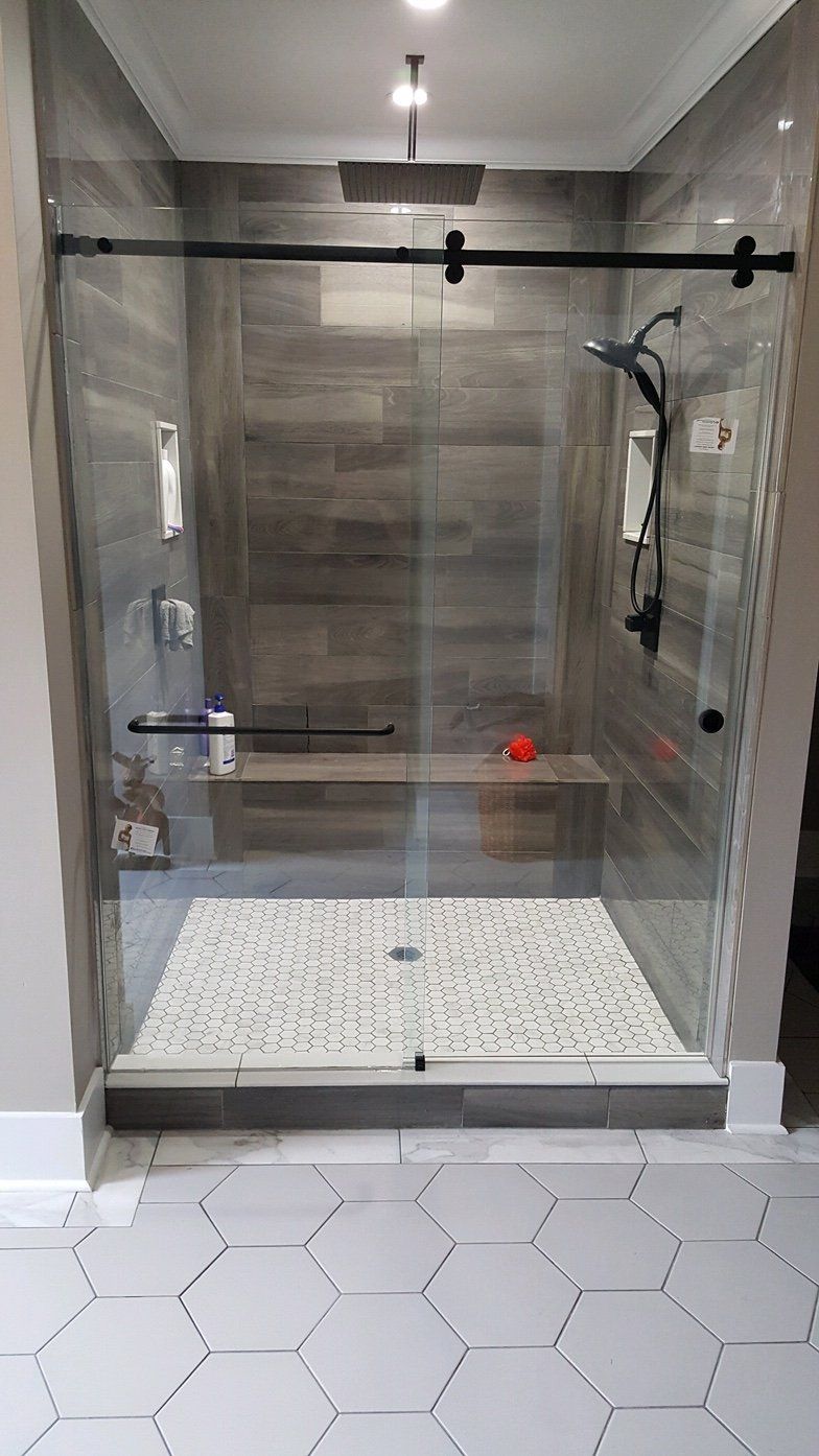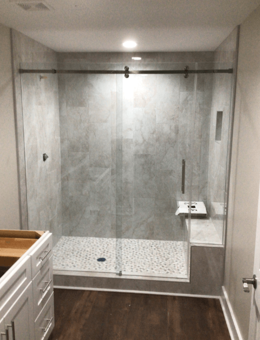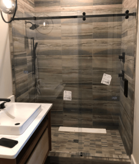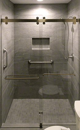 The Serenity Sliding Enclosure (also known as a “barn door slider”) is constructed of 3/8” Glass and includes one sliding door with a fixed inline panel. A ninety-degree configuration is also available. The Serenity enclosure has an updated look from traditional sliding shower door systems. The use of minimal hardware provides a nearly frameless look that gives the enclosure an almost floating appearance. Specially designed roller bearings allow for easy opening and closing of the door. The unique roller system operates above and below the header bar that spans across the top of the enclosure. A flush pull handle or ladder pull handle is available.